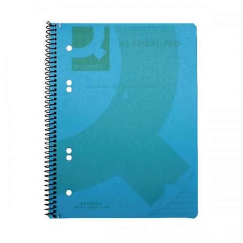 Ideal for everyday use, this Q-Connect A5 notebook features a spiral binding with durable, wipe clean polypropylene covers. The notebook contains 160 pages (80 sheets) of 70gsm woodfree paper, which is feint ruled with a red margin for neat note-taking and micro-perforated for ease of use. Both the pages and the covers are hole punched for ease of filing. This pack contains 5 notebooks with translucent blue covers.